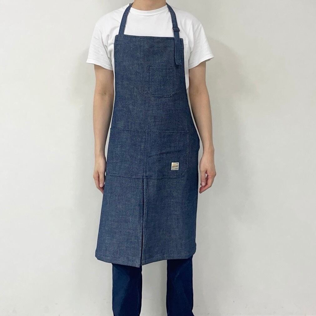長めの着丈がサマになり、スリットがあるため、座った状態でも足の動きを妨げずに、快適に着用できるデニムエプロン。